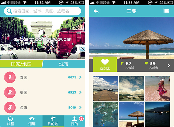 根据用户沿途记录的城市,“目的地”中将这些国家、城市信息进行了汇总,单个页面聚合了所有用户在该城市记录的照片。有趣的是,你每签到一个国家,系统就会给你颁发一个护照。
