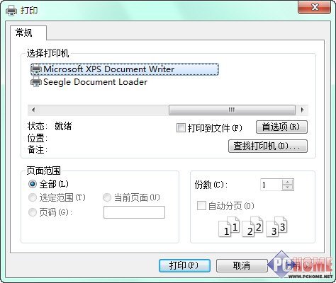 用户可以通过各种应用软件菜单中的打印命令,并选择打印机为“Microsoft XPS Document Writer”就能将文档变成XPS格式。至于查看,只需在Windows 7系统下双击XPS文档,就会自动调用系统内置的查看器打开。