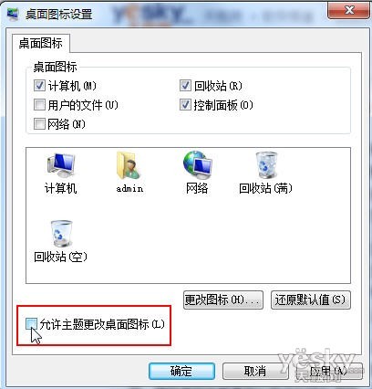 现在,我们的Win7桌面图标设置就被固定住了,当前的个性化图标设置不会随着Win7主题变来变去。如果有时候需要让主题修改配套图标,用相同的方法进入设置界面,勾选这个选项,确定就可以了。