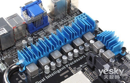 扩展方面,主板提供了3条PCI-E x16插槽,支持AMD CrossFireX。支持混合交火。此外主板支持2条PCI-E x1插槽和2条PCI插槽。