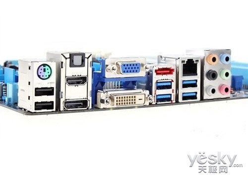 背板部分,主板提供了2个USB2.0接口,4个USB3.0输出接口,HDMI/Display Port/VGA/DVI视频输出接口,E-SATA接口,千兆网卡和8声道音频输出。