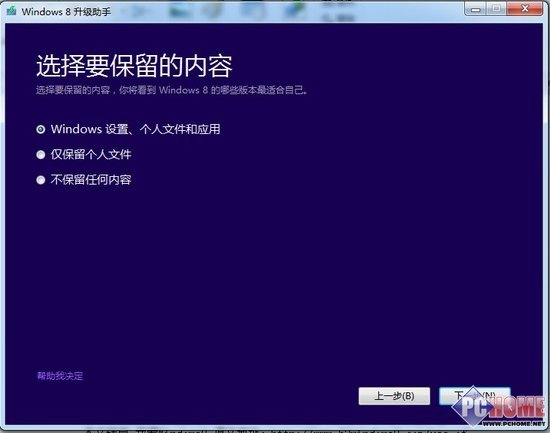 2、选择保留内容:这项内容应该是为升级到Win8做准备,根据不同的保留项目,否则选择保留的话,当前系统下的设置和个人文件/应用可平滑过渡到Win8系统下,继续使用。