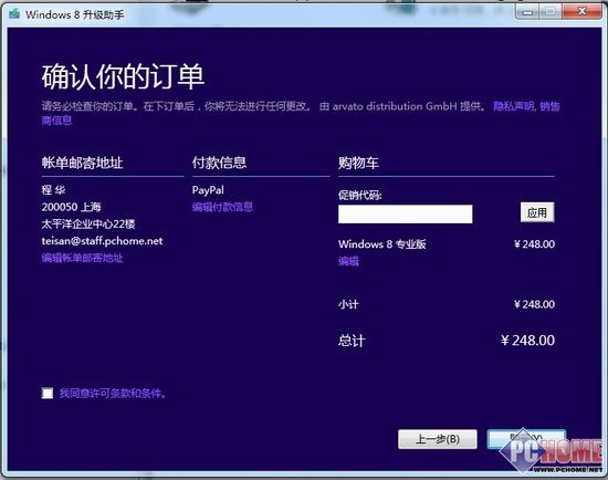 3、订购:完成上述两项之后就将弹出购买对话框,直接点击订购按钮就将开始下载Win8升级包,前提是你的C盘空间有大于4GB的容量,否则将无法 进行下载工具。一旦空间足够久进入订单生产界面,单击“结账”完成随后的支付流程,最后就可以开始下载Win8吧,正式开始升级之旅。