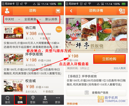 在屏幕上方的导航栏中,用户可以自行设定团购所在商圈区域、团购类型(美食、娱乐、结婚、购物等等),还可以按距离、购买人数、价格等分类对结果进行排序。看到让你直流口水的美食了?那就赶紧点击查看详情页面吧。