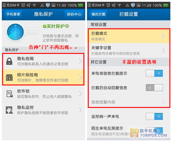 除了常见的加速、查毒以及骚扰拦截功能之外,腾讯手机管家还有强大的隐私保护功能,用户可以轻松加密短信、通话记录,当然还有宝贵的照片视频,从此各种“门”事件将不会发生。软件的设置选项很丰富,用户可以根据需要自定义拦截功能,充分发挥软件的强大保护力。