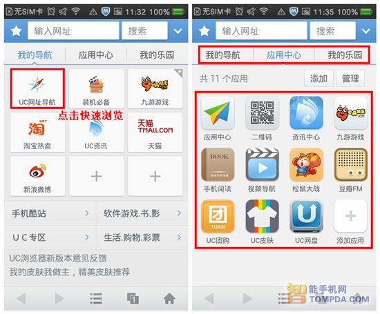 打开UC浏览器,我们可以看到3个导航栏、9个快捷网址按钮,以及酷站导航与软件游戏专区等内容,无论是访问已保存的快速网址,还是浏览名站都很方便。切换至“我的应用”页面,用户还可以使用二维码、手机阅读、UC网盘等特色功能,极大提升了用户的浏览体验。