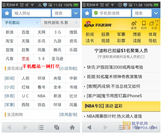 UC浏览器的酷站导航栏目中,几乎包含了所有用户访问量最高的热门网站,轻轻一点网站名称就可以快速打开主页进行浏览。无论是在蜂窝数据还是WIFI环境下,网页的打开速度都很令人满意。