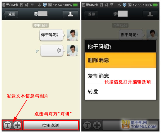 想 跟谁聊天只要点击TA的名字,即可进入聊天页面。在这里,我们可以给好友发送文本信息、表情图片,这点跟使用移动QQ没有太大区别。接下来的功能就有意思 了,想和亲友随时“对讲”吗?那就赶紧和TA通话吧。微信支持发送每条不超过1分钟的语音信息,且占用流量极少,如果开了WIFI更是可以和亲友无限畅 聊,大大的节省了话费。