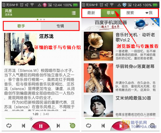 除了歌词之外,多米音乐还可以显示歌手的简介与专辑介绍,内容详尽且实时更新,这在音乐类软件中并不多见。本地的歌曲再动听也有腻歪的时候,轻轻点击屏幕上方的“最新”以及“歌单”按钮,即可打开海量的在线曲库。多首新歌速递以及专题赏析,肯定会你的耳朵享受一场盛宴。