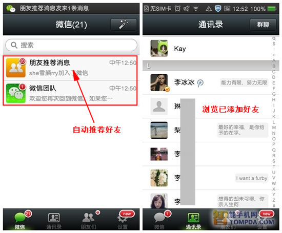 首次打开微信,系统“朋友推荐消息”插件会自动从用户的手机通讯录中搜索微信用户,并将他们推荐给你。除了普通好友之外,你还可以添加自己喜爱的时尚明星,随时关注TA的动态。好友添加完成后,在软件的“通讯录”菜单中可以查看浏览。
