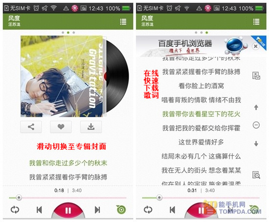 不少朋友听歌的时候都喜欢看着歌词哼唱,无论手机在蜂窝数据或WIFI网络下,多米音乐都可以为用户迅速下载歌词内容以及专辑封面。歌词支持多种显示方式,同时支持拖曳方式快进歌曲,使用很简单。