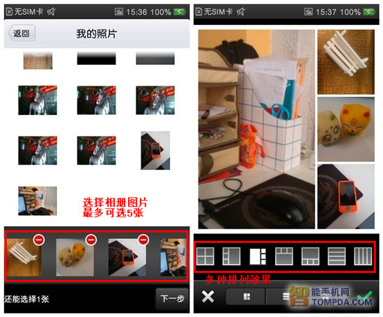 在 WIFI联网的环境下,Weico 2.0打开大图的速度,可以用“秒杀”来形容,多图杀猫早已成为历史。光看别人的图哪过瘾,自己的靓照想要分享给大家,现在有了全新拼图方式。点击昵称旁 边的+号打开微博发送选项,再次点击蓝色的按钮,即可打开拼图功能。首先我们要从相册中选择几张图片,最多可选5张来做素材,选好之后点击“下一步”,进 入图片的拼图方式选择步骤。系统提供了框架、并列和自由这3种拼图模式,其中框架模式中还包含了7种排列效果,用户的选择非常多样化。