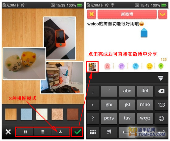 取得满意的排列效果之后,你就可以点击屏幕右下角的绿色对勾,保存当前的内容了。系统在保存图片后会自动跳转至新微博发送页面,赶紧把你刚拼好的靓图分享给好友欣赏吧。