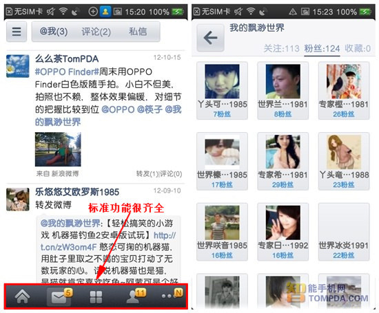 Weico 2.0与官方新浪微博客户端在常用功能方面,没有太大的差异,无论是首页浏览、查看我的微博、关注的人以及粉丝等操作,都很方便。菜单图标的排列,也很符合大部分用户的使用习惯,上手很容易。