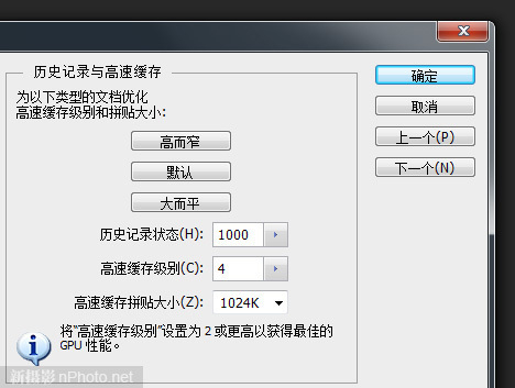 选择“编辑”-“首选项”-“性能”,设置“历史记录状态”确保自己可以随时恢复已经对照片做过的处理。这个值默认是20。我把它设为最大值1000。