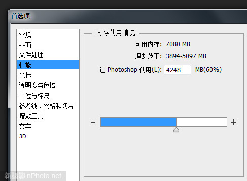 处理图片需要比较大的内存才能保证速度,所以我们需要确保Photoshop有足够的内存来保存大量数据,具体数值可以根据你的内存容量而定。