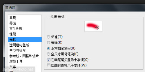 我喜欢使用“正常画笔笔尖”的光标,并显示十字线。你也许会想试试其他光标,可以逐个选择尝试一下,看看哪种最适合自己。