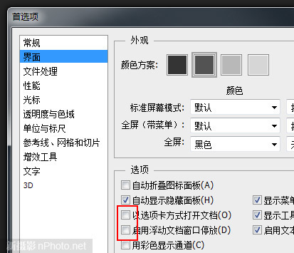 我不喜欢Photoshop默认的以标签页的方法排列打开的文件,而喜欢将各个文件独立自由浮动在窗口中。如果你也喜欢这样,可以在“界面”设置中取消“以选项卡方式打开文档”和“启用浮动文档窗口停放”两项。