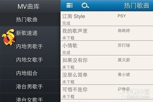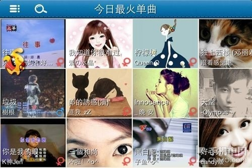 而充满内涵之处还在于屏幕左上角的功能按钮,点击即可弹出抽屉式菜单,这里不仅有更详细的歌曲分类,还提供了“新歌速递”专栏。这样的歌曲展现形式让用户完全感觉到了KTV点歌界面,操作更容易上手。