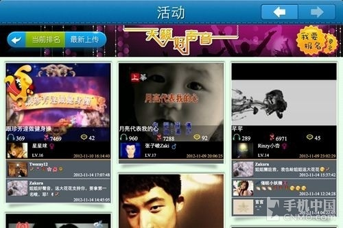 这款软件的互动环节,除了麦霸专区之外还包括一个活动专区,这里会有天籁K歌官方举办的一些活动,比如正在进行中的“天籁好声音”,用户通过报名并提交作品就可以参与了。当然这里还是一个学习的平台,在众多帅哥靓女之中有没有哪个妹子是你最喜欢的麦霸呢?