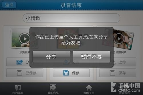 制作好的歌曲录音可以保存在设备本地,也可以分享到各种社交平台,当然所有的录音都可以在“我的主页”列表中找到。