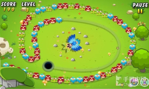 游戏就像是百鸟朝凰一般,一改以前的神秘作风,成了各色小鸟的乐园了。玩法上与祖玛无异,同样是要进行同色消除。不同的是,界面更加卡通风了,射击的不是球,而是小鸟,发射者不是青蛙变成了凤凰。