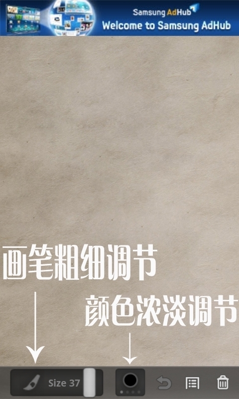 软件的使用非常简单,打开软件,主界面就是一张画纸,下面是画笔的相关选项。左侧的为画笔的粗细调节,调节范围为1-40个像素指间。