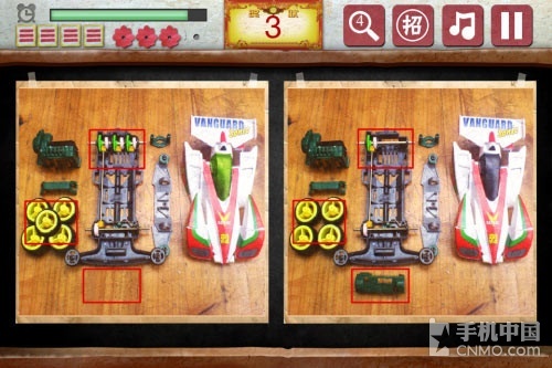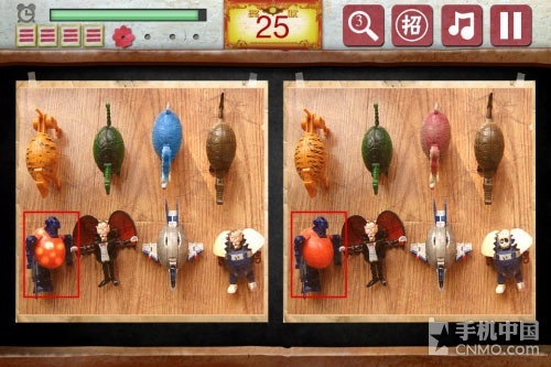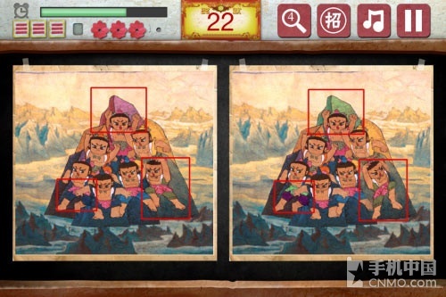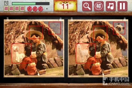 找茬游戏的操作都是一样的,在这里笔者也没有什么可再过多介绍的了。80后回忆找茬这款游戏所不同的就是,每关只有4处的不同,每每找到一处不 同的时候,会有个大红花的奖励,如果点错的话,左上角的三道杠就会少掉一个,同样,每关有4处点错的机会。其他方面,右上方的放大镜是提示功能,一共5 次,旁边的“招”字是提供给玩家额外的提示机会,不过这里限定每天只有两次机会。