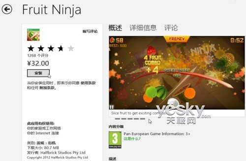 我们在Win8应用商店中还可以搜索到熟悉的其他游戏,比如水果忍者、切绳子等等。Win8应用商中的许多付费游戏支持免费试用。玩家可以先试玩再决定是否购买完整版游戏,购买完整的游戏后无需再次下载,付费即可激活完整的游戏内容,可以保留了玩家的游戏记录等重要数据,也可以节约硬盘空间。