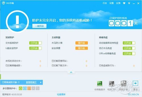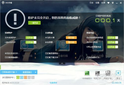 掀起国内杀毒软件免费旋风的360旗下的360杀毒软件同样不可小视。目前最新版360杀毒4.0拥有小红伞和BitDefender两大知名反病毒引擎及第二代QVM引擎,还有加强版沙箱、“云动”清爽界面。