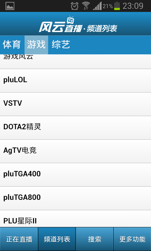 从下面的截图大家可以看出这款应用内置频道之全,风云直播分为体育、游戏和综艺三个栏目。其中体育栏目内置超过50条体育频道,包括著名的ESPN、NBA和提供广东话评述的广东体育台,另更提供英超、意甲、德甲直播,更涵盖足球、高尔夫球、羽毛球和篮球等体育项目。