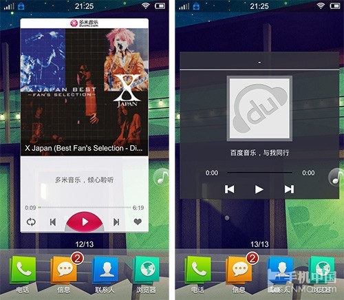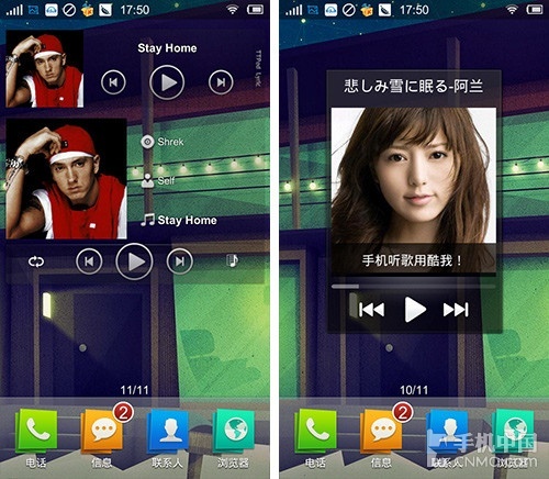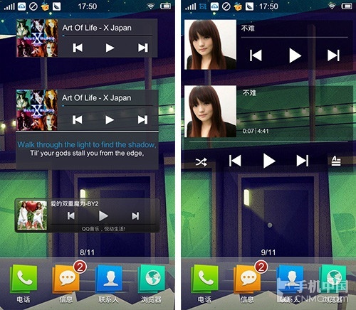 桌面插件以及工具对于用户来讲就是利民工程,用户当然希望功能越全越好,在这几款音乐软件种,酷狗音乐表现得最全面,特别是下拉通知栏的控制表 现不错,可以方便用户不用切出程序,完成下拉通知栏并切歌,在目前对比的几款机型中,仅有酷狗音乐做了下拉通知栏的控制。但要说插件的设计风格,多米音乐 的插件设计风格更加漂亮。