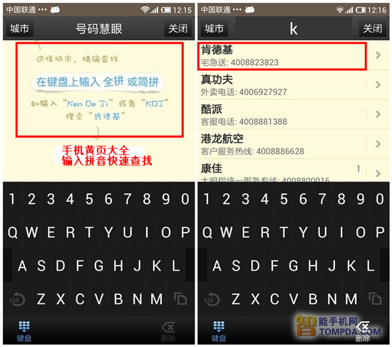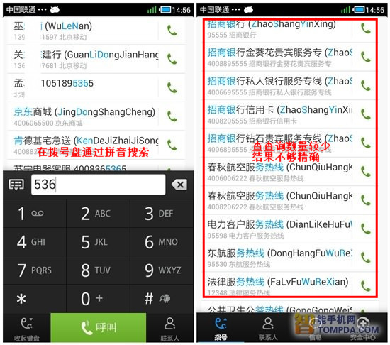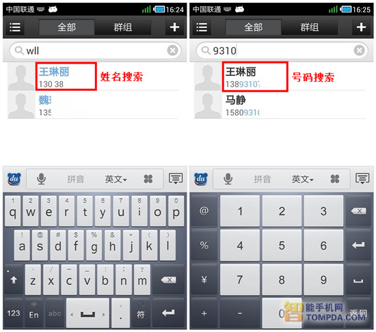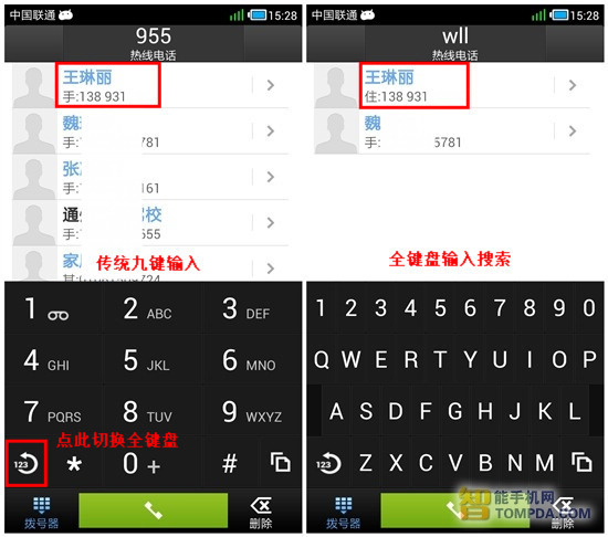 在触宝拨号的拨号键盘中,默认使用九宫格输入,只要点击左下角的“123”按钮即可切换为全键盘模式。从截图可清晰的看出,与9键方式相比全键盘输入的搜索结果显然更加精确。
