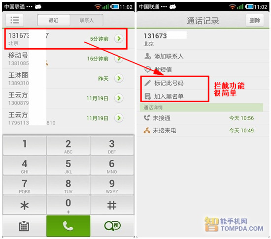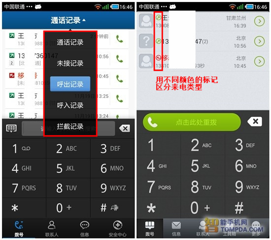 注:来电通的通话记录中并没有分类列表,而是以不同颜色的标记作为区分。