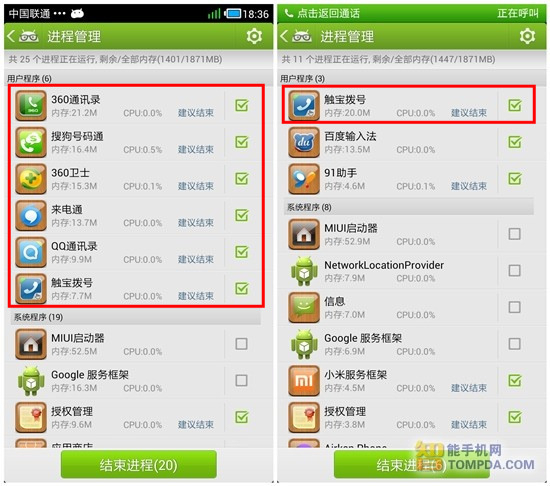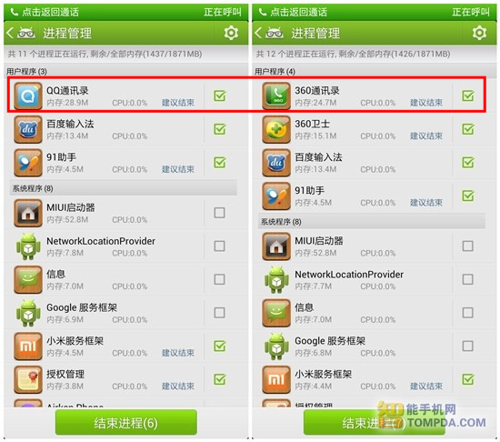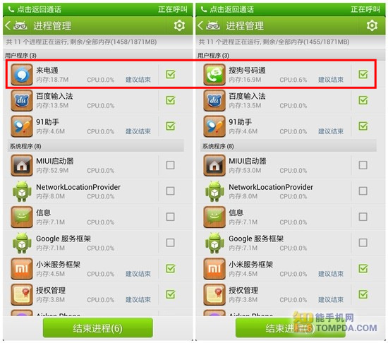 拨号状态内存占用 | 手机重启后,分别运行五款软件拨打电话,查看内存占用 |