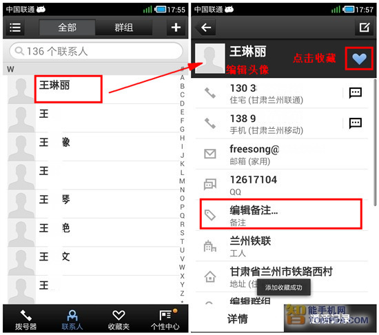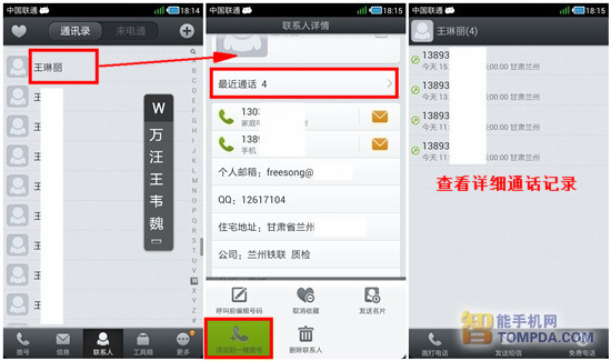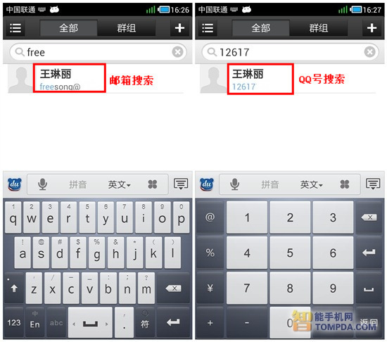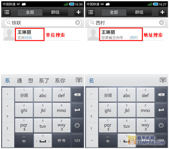 QQ通讯录仅支持联系人的部分信息项搜索,此外它也存在和触宝一样的问题,即有两个号码的联系人,仅显示姓名和默认主号码,如需拨打另一个号码,需进入详情后选择。