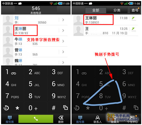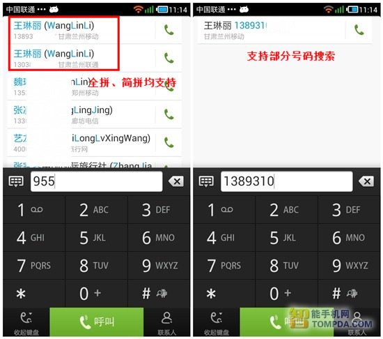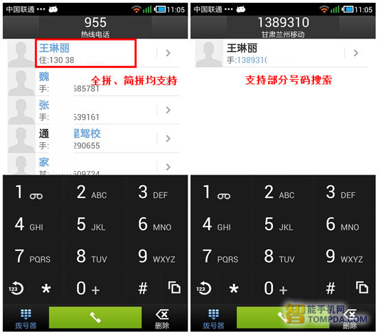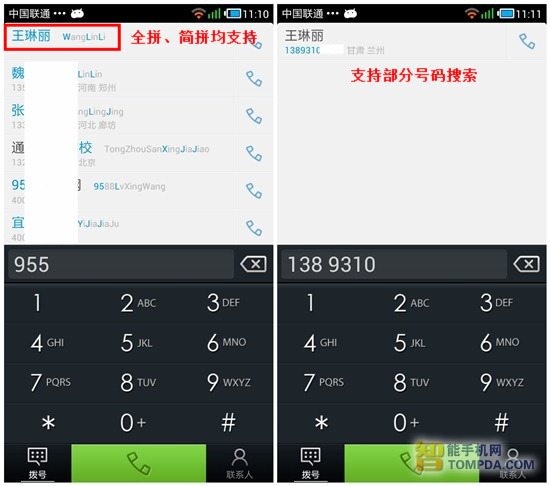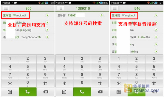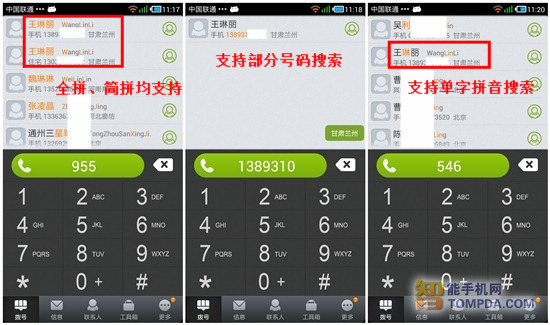 给某人打电话首先要找到TA的号码,自带拨号程序通常仅支持姓氏首字母定位,频繁的上下翻查非常浪费时间,动作快了还容易滑过头。如何才能 更准确的找到联系人?比如输入姓名全拼、简拼,或只输部分电话号码即能定位到TA。下面我们以搜索联系人“王琳丽”为例来测试这个功能: