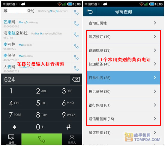 黄页分类浏览 | 11个类别,同时支持拨号盘搜索 |