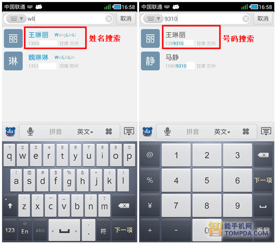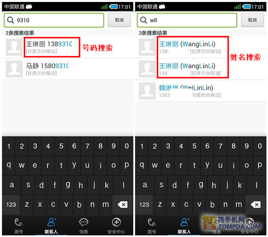 经测试来电通仅支持按姓名搜索联系人,结果仅显示为姓名,对多号码联系人来说拨打稍有不便;搜狗号码通不支持独立的联系人搜索与管理,只能在拨号盘中进行搜索。