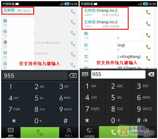 市面上大部分手机都采用全触屏操作,模拟拨号盘的输入模式通常有九宫格与全键盘两种,从定位精确度上来说,后者的表现更加出色,而用户往往 各有所爱。五款参评软件是否支持拨号键盘模式的切换,从而更好的满足用户不同的输入习惯?同样以搜索联系人“王琳丽”为例,测试一下这个功能: