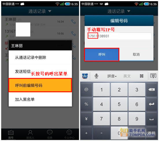 呼叫前编辑号码 | 拨号前可手动添加IP号码 |