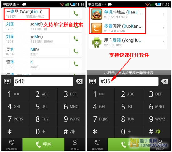 360通讯录的拨号搜索方式比较丰富,其中最后一项比较独特,例如:输入#35可快速打开“多看阅读”等名称简拼相符的软件。该功能虽不能拨打电话,却能让用户快速打开软件,实用性很不错。