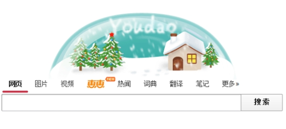 有道搜索的首页Logo也比价简单,纷纷大雪下温暖的小屋亮着橘色的灯光,静谧、温馨。