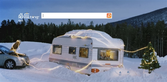 微软必应首页今天也放上了节日气氛浓厚的图片,这是一则动态图片,你的平安夜有何计划?想不想与爱的人在远离城市喧嚣的房车中共度浪漫?白雪纷纷落下,用汽车的电池点亮灯饰。