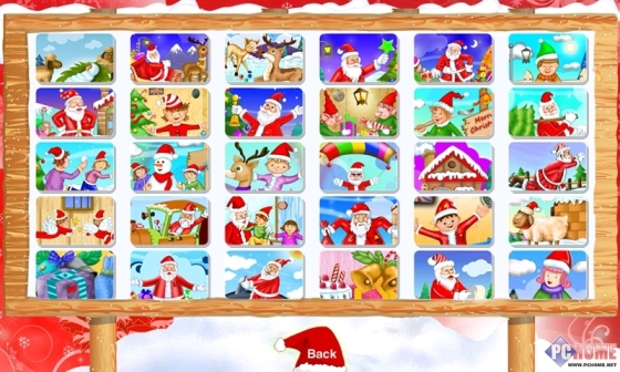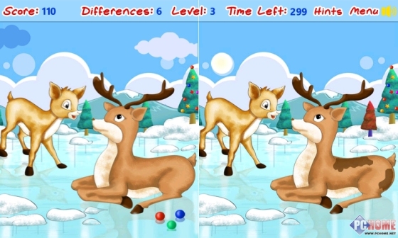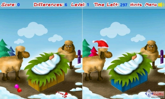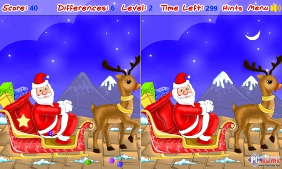 各种圣诞节主题的图片,两张并排让用户寻找区别,找对了加10分,找错了扣5分,全部找到两张图片的区别后,才能进入下一副图片,还好游戏开头就让用户选择各种关卡图片,全部免费的。