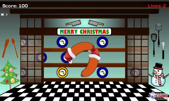 仔细看来,这款游戏场景也是圣诞节主题,游戏场景除了餐具外,还有圣诞树,移动的菜盘子,菜刀等等,香肠可以任意横着或者竖着切片,切开的时候很有感觉,免费游戏哦。