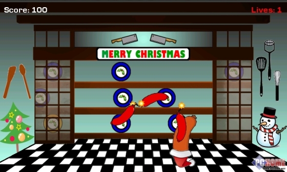 不仅仅切香肠片让人有畅快感,而且游戏里的香肠都戴了圣诞老人帽子,更加增加趣味性,此外,不要切到燃着导火线的小红香肠哦,切到就爆炸,游戏立刻结束。