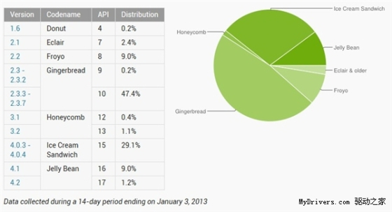 根据谷歌对Android平台的最新跟踪统计数据显示,Android 4.0冰淇淋三明治系统已经覆盖了约三成的Android设备,而Android 2.3姜饼系统的份额虽然依旧为最高的47.6%,但该比例则首次跌破50%,这证明已经有更多的Android设备厂商以及用户开始推出和使用基于新版本Android操作系统的设备。