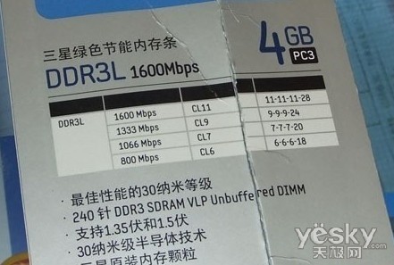 三星4GB DDR3-1600内存单条容量为4GB,运行频率为DDR3-1600(等效于PC3-12800),标准时序11-11-11-28。其编号为 M379B5273DH0-YK0,于2011年第39周产于韩国三星内存工厂。金手指方面采用流行的化学镀工艺,耐磨度较高。在标签下面印有 “GREEN DDR3”的烫金字样。