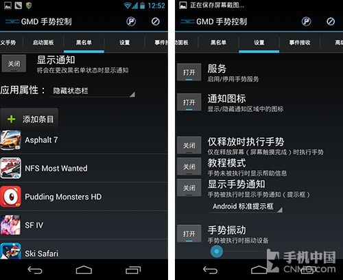 除此之外,GMD手势控制也支持了全屏功能,可以帮Android 4.0以上机型自动隐藏掉屏幕下方的虚拟按键,你同样可以像手势一样设置某些应用中隐藏虚拟键,这样玩游戏或者看视频,虚拟键就不会占用屏幕空间 了,GMD手势控制是一款相当强悍的插件,如果你的手机有虚拟键,那么你可以安装GMD手势控制试一试。